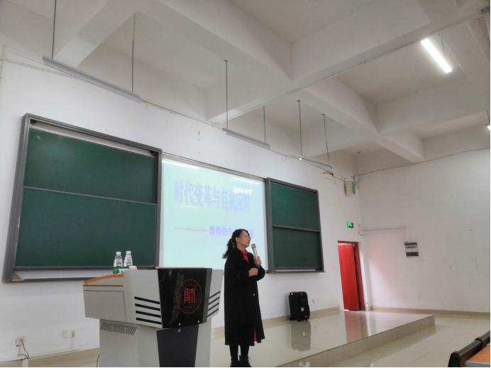 2019年10月22日下午14:30,历史系邀请贵州省教科院历史教研员张文英老师前来为历史系全体同学做讲座,讲座主题为《时代变革与自我应对——教师的专业化发展》,本次讲座作为“中学历史教学前沿系列讲座”之第一讲,旨在为同学们带来最前沿的历史教学方面的理论与知识。讲座由系主任苏聪老师主持,徐杨老师参加讲座并与张文英老师深入交流。